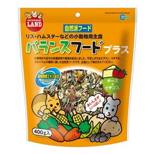 ※画像はイメージです。パッケージデザイン等は予告なしに変更されることがあります。※メーカーの欠品や製造中止により納期遅延、またはお届けできない場合がございます。マルカン ML‐03 バランスフードプラス 400g 発売日:2013年11月5日●イチゴとチーズの香りでさらにおいしくなった、小動物の栄養補給に適した自然派フードです。【仕様】用度:小動物フード原産国:インドネシア原材料:とうもろこし・大麦圧ペン・ひまわりの種・ハムスター用ペレット・脱脂大豆粕・アルファルファ・チキンミール・魚粉・油脂・米胚芽大豆発酵抽出物・ミネラル類・甘味料・ビタミン類・着色料・えん麦・マイロ・チーズ粒・イチゴ粒・ミネラル類・増粘安定剤・pH調整剤・保存料・香料・着色料・酸化防止剤・ポップウィート・イナゴ豆・ニンジン・ポップコーン・ジャガイモ・米胚芽発酵抽出物