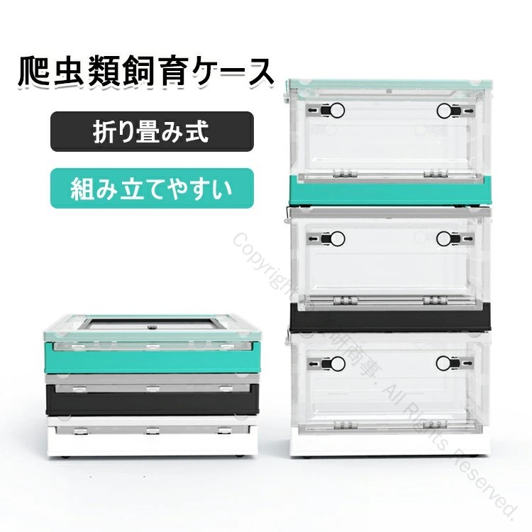 【カラー】ホワイト、グリーン、ブラックホワイトS グリーンS ブラックS ホワイトL グリーンL ブラックL【使いやすい飼育ケージ】折り畳み式なのでほかの飼育ケースより使いやすいし収納ももっと便利です。折りたたみ状態の高さはわずか7.5cmため携帯や持ち運びに超便利!スタイリッシュで個性的なデザインでおしゃれさをアピールできます。【通気性満点】側面には18個の通気孔がありますにもかかわらず、天面は通気性の良いメッシュを採用していため、通気性に優れています。また、天面のスクリーンメッシュは開閉脱着式なので、楽に手入れができます。ご注意:小さい爬虫類は通気口から脱走するおそれがありますのでご注意ください。【脱着式キャスター付き】脱着式キャスター付きだから、重くなっても移動が楽々で、不要な時も取り外すことができます。また、底部にはパネルヒーターを設置しやすいフレーム形状を採用しています。【あらゆるペットに対応】見やすい透明な樹脂製爬虫類ケージ、丈夫なので爬虫類のひっかき傷が付きにくく、ケージ内をクリアに見るため、ペットの様子を簡単に確認できます。 上部が開くことが出来るに加えて、側面にも大きな開口扉があるので、用途に合わせて使い分けることができ、大は生き物の移動や掃除時に、小は餌や水やり時に便利です。※簡易包装となりますのでご理解の程よろしくお願いします。※手動測定による1〜3cmの測定偏差を許容してください。※モニターや光の効果が異なるため、実際の色は写真の色と若干異なる場合があります。※仕様・デザインは改良のため予告なく変更することがあります。 指定された配送時間は承っておりません。【美研商事】