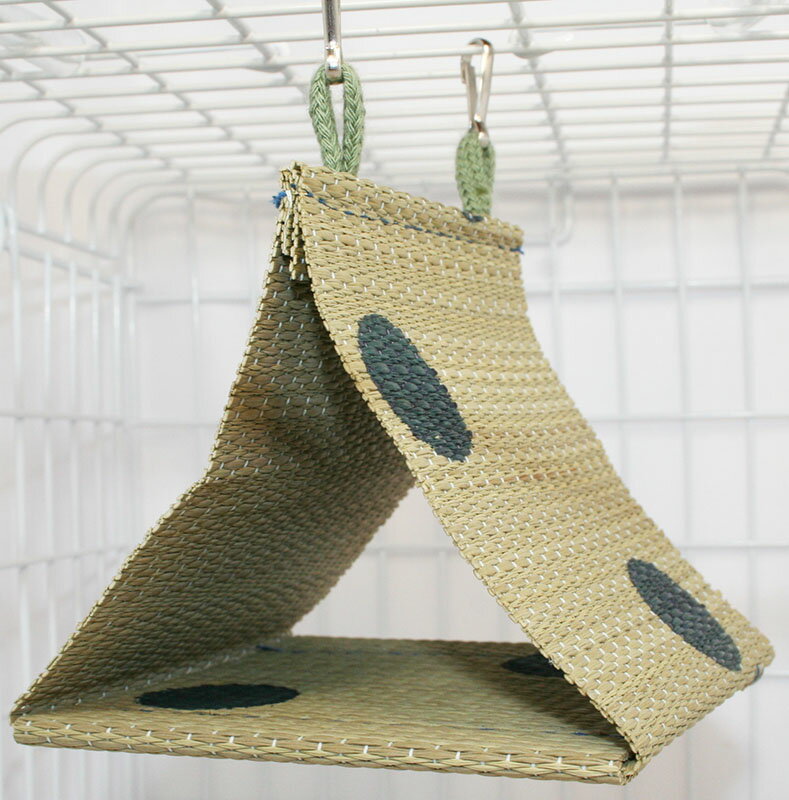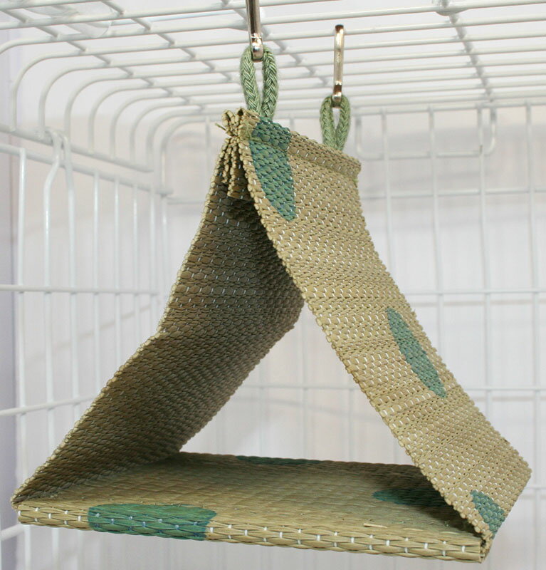 ●こちらの商品は、メール便対応商品になります。● メール便ご希望のお客様は、お会計時に配送方法をメール便に変更してください。 詳しくは決済・配送・返品のメール便の欄をご覧ください。 ※配送方法がメール便のご指定がない場合は、 対応商品でしても宅配便にて発送させて頂きますので、ご注意ください。 熊本県産のい草で編み込みました。敷物のいわゆる「ござ」を生地として、三角に折り、底は網目を交差させて2重に貼り合わせて小鳥用のテントを作りました。緑のドット柄のプリントは涼しさも感じさせてくれます。い草には、空気清浄力や消臭作用もあり、快適に休めるお気に入りの場所に♪【サイズ】約11cm角の3面テント【原材料】熊本県産い草【原産国】日本【販売元】P2&Associates Inc. 福岡県糟屋郡