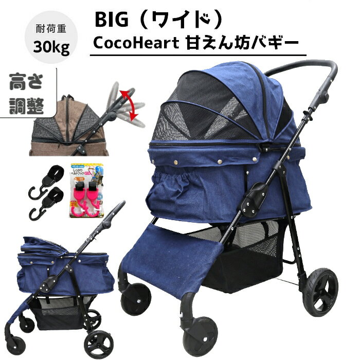 商品情報本体サイズ本体サイズ(完成時) 高さ 102cm 奥行 69cm 幅:後輪 57cm 前輪 47cm(折りたたみ時)厚み38cm×幅57cm×長さ92cm居住区サイズ(外寸) 高さ 57cm 奥行 67cm幅 39cm (内寸) 高さ 52cm 奥行 65cm幅 36cm 下カゴ 高さ 15cm 奥行 36cm 幅 35cm重量約8kg 耐加重30kgカラーデニム(DENIM)同梱取り扱い説明書1点ベルトフックダブル説明大好評だった『ココハート 甘えん坊バギー 4輪タイプ』がワイドになって新登場!『中型犬用にもう少し広かったらいいのに・・・。』とのお声を多く頂いておりました。そこで登場したのが『ココハート 甘えん坊バギーBIG 4輪タイプ』従来の4輪モデルよりワイドサイズになり中型犬もらくらくリラックス!大好評だった『ココハート 甘えん坊バギー 4輪タイプ』がワイドになって新登場!『居住区 生地』生地部分は厚めの生地(表面の生地だけで900デニールを使用)を2枚張り合わせて使用しておりますので高級感があり破れに強いです。内側は汚れ等に強い防水系の生地なので汚れ等ふき取りやすくなっています。(デニムはジーンズと同じ丈夫な綿生地を使用している為、内側生地は付いておりません。)さらに居住スペースに飛び出し防止用に伸縮可能(37〜60cm)な幅2cmの丈夫なリードが2本あり、活発な子には安心です。『タイヤ』車輪は路面からの振動を軽減するように振動を吸収するに適した環境にも優しいEVA素材を使用。タイヤサイズは小回りと安定感を考え前輪13cm、後輪19cmにしております。後輪にはブレーキを完備しておりますので停車時にバギーを固定できます。『フレーム』直径約2cmの丈夫なスチールフレームを採用しておりますので中型犬の重量にも余裕の対応。『うれしい新機能』画像にありますようにペットカート単体での自立が可能ですので置き場所にも困りません!お客様の扱いやすい高さにハンドルの高さが調節できます!バスケット前後に収納に便利な大型ポケット付き!屋根部分のみの取り外しも可能です!こちらの商品は組み立て式になりますが、工具等も一切必要無く簡単に組み立てる事が出来ますのでご安心下さい。こちらの商品は居住区バスケット部分の取り外しが出来ません。バスケット部分が取り外せるタイプをご希望の方は『ペットカート シュシュ ココハート』で検索!★様々な場面で活躍します★・通院・旅行・災害・避難・地震・観光・公園・ショッピングモール・海水浴・キャンプ・ソロキャンプ・バーベキュー・BBQ・グランピング注意こちらの商品はお客様の声を活かし、常にマイナーチェンジ(ホイール・フレーム等の変更)を行っております。※犬図鑑※【超小型犬・成犬体重 4kg未満】カニンヘンダックスフンド・スムースコートチワワ・タイニープードル・チワワ・ティーカッププードル・トイプードル・トイマンチェスターテリア・パピヨン・ブリュッセルグリフォン・プチブラバンソン・ベルジアングリフォン・ボロニーズ・ポメラニアン・豆柴・マルチーズ・ヨークシャーテリア・ロングコートチワワ【小型犬・成犬体重 10kg未満】イタリアングレーハウンド・ウェルシュテリア・ウエストハイランドホワイトテリア・キャバリア・ケアーンテリア・シーズー・シーリハムテリア・シェットランドシープドッグ・柴犬・ジャックラッセルテリア・スキッパーキ・スコティッシュテリア・チベタンスパニエル・チャイニーズ・クレステッド・ドッグ・狆(チン)・ノーフォークテリア・ノーリッチテリア・パグ・ビションフリーゼ・ペキニーズ・ボストンテリア・マンチェスターテリア・ミニチュアシュナウザー・ミニチュアダックスフンド・ミニチュアピンシャー・ミニチュアプードル・ラサアプソ・レークランドテリア・ワイアーフォックステリア【中型犬・成犬体重 25kg未満】アメリカンコッカースパニエル・アメリカンスタッフォードシャーテリア・アメリカンピットブルテリア・イングリッシュコッカースパニエル・イングリッシュスプリンガースパニエル・ウィペット・ウェルシュ・コーギー・ペンブローク・ウェルシュ・コーギー・カーディガン・オーストラリアンケルピー・甲斐犬・キースホンド・紀州犬・ケリーブルーテリア・コーイケルホンディエ・四国犬・シャーペイ・ジャーマンピンシャー・スタッフォードシャーブルテリア(スタッフィー)・スタンダードシュナウザー・スタンダードダックスフンド・日本スピッツ・バセットハウンド・バセンジー・ビーグル・フレンチブルドッグ・ブリタニースパニエル・ブルドッグ・プチバセットグリフォンバンデーン・北海道犬・ボーダーコリー・ポリッシュローランドシープドッグ・ミディアムプードル・ミニチュアブルテリア【数量限定 レインカバーSET】【公式ストア】甘えん坊バギーBIG(ワイド)4輪ペットカート(デニム DENIM)耐荷重30kg 中型犬〜大型犬 ペットバギー(ベルトフック付)対面式 自立式 フルオープン 猫ちゃん対策済 移動ストレス軽減 介護に大活躍 折畳 旅行 通院 ハンドル高さ調整 CocoHeart(ココハート)