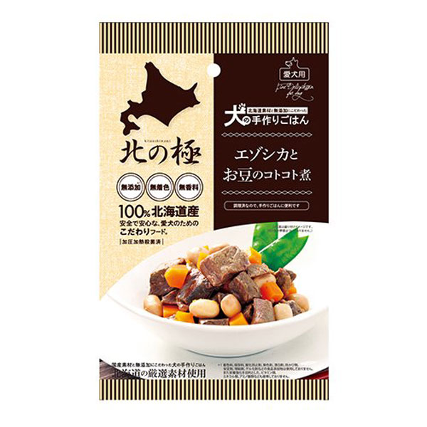 【商品スペック】 ■成分 ( % ) 粗タンパク 23.3%以上 粗脂肪 3.6%以上 粗繊維 0.4%以下 粗灰分 0.7%以下 水分 69%以下 糖質 3.0%(100gあたり) ■代謝エネルギー/139cal / 100gあたり ■原材料:エゾシカ肉、大豆、人参 ※全て北海道産を使用 ■内容量:60g ■殺菌処理方法:加圧加熱処理(レトルトパック) ■原産地:日本 ■賞味期限:製造日から1年6ヵ月 ■パッケージサイズ:205×130×20mm エゾシカとお豆のコトコト煮は100%北海道産♪ ヘルシーなエゾシカ肉を、大豆と人参と一緒に、丁寧にコトコト煮込みました☆ 【素材にこだわった商品】 『北の極』が使用するエゾシカ肉は野生肉の臭みを消す為に血抜きをしています。 新鮮なエゾシカ肉を人間が食べられるレベルで丁寧に処理をし、また、余分な添加物は 一切入れずに作っております。 お肉は加熱後、レトルト加工しておりますので、そのまま与えられ、旅行やお預かりの際にも便利です。 ■1日あたりの給与量 体重 / 給与量(目安) 超小型犬(5kg以下) / 1/4〜1/2袋 小型犬 (5〜11kg) / 1/2〜1袋 中型犬 (11〜23kg) / 1〜2袋 大型犬 (23〜40kg以上) / 2〜3袋 全犬種生後6ヶ月から与えることが可能です。 ドライフードに代表される総合栄養食を与えてるワンちゃんには、今までのフードを3割程度減らし7割程度にして頂き、上記の給与量を目安にフードへトッピングして与えて下さい。 お肉に付着した白い物は、お肉の脂が固まったものですので、品質には問題ございません。 【注意事項・鹿肉の特性について】 鹿肉を愛犬に与えるとうんちがゆるくなる場合があります。 また、今まで鹿肉を食べても大丈夫だった愛犬でも、突然、うんちがゆるくなるケースもございます。 これは鹿肉の豊富な鉄分含有量に関係しており(レバー(肝臓)に似た栄養素)、愛犬に合わなくなる場合があるためです。 愛犬の体調によって変わりますが、その場合は、与えるのをおやめください。