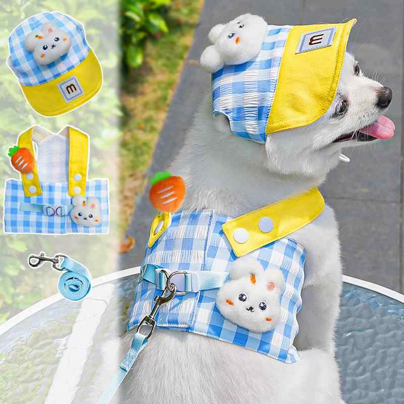 ペット 服 帽子 ハーネス リード 3点セット 春夏 犬猫兼用 ドッグウェア かわいい チェック柄 ポリエステル 小型犬 お散歩 お出かけ