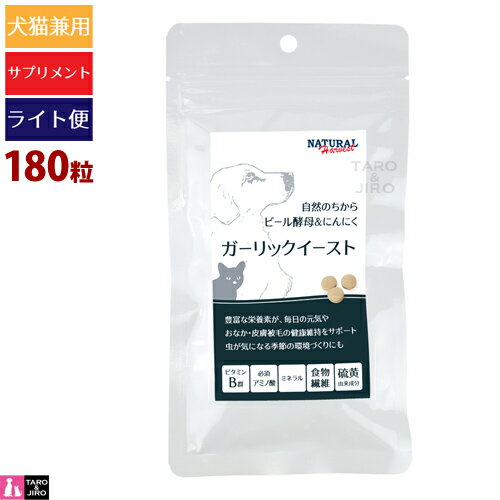 特徴 発売から20年以上の安心のロングセラー商品 豊富な栄養素が毎日の元気や、おなか・皮膚被毛の健康維持をサポート ビール酵母&にんにくの自然な力で虫をよせつけない 犬猫兼用サプリメント ビール酵母 × ガーリックの組み合わせで、おいしく・やさしく・内側から元気をサポートします。 外部寄生虫が嫌がる硫黄成分をたっぷり含んでいるので、駆除薬を使いたくない方、駆除薬を使いたくても使えない子へおすすめです。 ● 自然由来の栄養補助 高品質なビール酵母に、適量のガーリックを配合。毎日の食事に手軽にプラスできる粒タイプです。 ● 必須アミノ酸とビタミンB群 10種の必須アミノ酸と、皮膚・被毛の健康維持に役立つビタミンB群をバランスよく含みます。 ● 腸内環境にも配慮 豊富な食物繊維がお腹の調子を内側からサポート。 ● ガーリックの適切な配合設計 ガーリックは安心して与えられる量で調整しています。 【ビール酵母の5つのちから】 ①ふわっとつややか、毛ヅヤや皮膚の健康維持に ビタミンB群やビオチンなど、毎日のケアにうれしい栄養がたっぷり。 ②カラダづくりを支える良質なたんぱく質 必須アミノ酸を含み、食事では補いきれない栄養を手軽にプラス。 ③食物繊維で毎日すっきり 天然由来の繊維成分が、おなかの調子や便の状態を整えるサポートに。 ④いきいきとした毎日を応援 ミネラル・核酸など、毎日をすこやかに過ごすための栄養素が含まれています。 ⑤香ばしい風味で食いつきサポート 自然な香りと味わいで、いつものごはんにおいしくプラス。 【ガーリックのちからにも注目!】 ガーリックは、古くから健康素材として親しまれてきた自然の恵み。 ・香ばしさと栄養を兼ね備えた仕上がり ・季節の変わり目のケアに取り入れやすい ・硫黄成分(含硫アミノ酸)を含み、においが気になる虫が寄り付きにくいとも言われています。 ◇ こんな子におすすめ◇ ・自然のちからで健康をサポートしたい ・必須アミノ酸やビタミンなどの栄養補給をしたい ・ガーリックを取り入れたいが、与える量に不安がある ・皮膚・被毛やお腹の健康が気になる ・ノミ・ダニが気になる季節に備えたい 保証成分 粗タンパク質 33%以上 粗脂肪 2.5%以上 粗繊維 20.0%以下 粗灰分 7.5%以下 水分 5%以下 代謝カロリー 249kcal/100g 原材料 ビール酵母(日本)、麦芽糖水飴(日本)、デキストリン(日本)、ステアリン酸マグネシウム(日本)、豚マローエキス(日本)、にんにく(米国)、ビタミンE(スイス)、ビタミンC(日本) ※()の中は原産国名です。 ※にんにくの使用量については細心の注意を払っております。 ガーリックイースト(犬猫兼用) 180粒 / 180粒(ライト便)