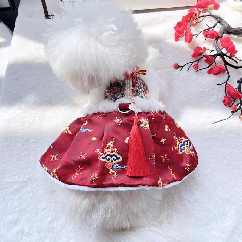 ペットウェア 犬猫用 お正月 晴れ着 中華風 唐装 ワンピース ロンパース 裏起毛 厚手 防寒 暖かい かわいい 小型犬 ポリエステル 綿素材 秋冬
