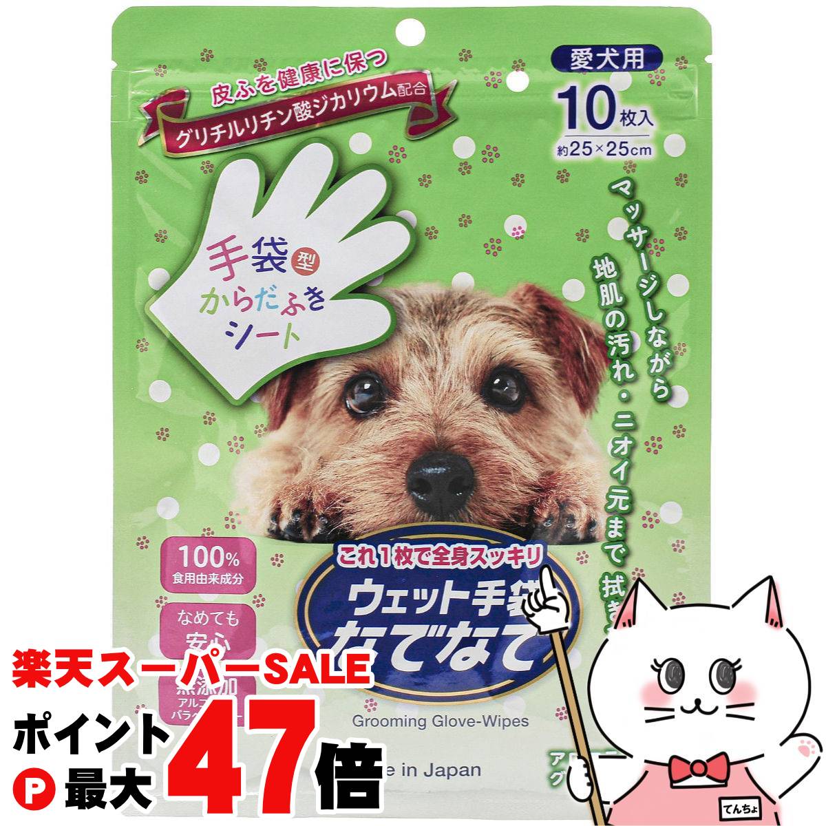 ・『手袋型』のウェットタオルなので断然拭きやすく、ワンちゃん、ネコちゃんもマッサージされている気分で嫌がりません。・シャンプーが大変な時、ケガや病気でできない時、高齢ワンちゃん・ネコちゃんにおすすめです。・ノンアルコールでなめても安心。・植物由来消臭成分配合でにおいスッキリ。・トリートメント効果で被毛サラサラ。・無香料タイプです。 商品情報 材質外側:レーヨン・ポリエステル、内側:ポリプロピレン使用時サイズ約25×25cm原産国または製造地日本 896002000