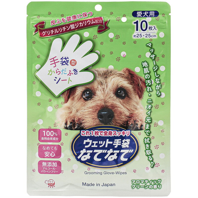 ・『手袋型』のウェットタオルなので断然拭きやすく、ワンちゃん、ネコちゃんもマッサージされている気分で嫌がりません。・シャンプーが大変な時、ケガや病気でできない時、高齢ワンちゃん・ネコちゃんにおすすめです。・ノンアルコールでなめても安心。・植物由来消臭成分配合でにおいスッキリ。・トリートメント効果で被毛サラサラ。・アロマティックグリーンの香りでペットもリラックス。 商品情報 材質外側:レーヨン・ポリエステル、内側:ポリプロピレン使用時サイズ約25×25cm原産国または製造地日本 896004000