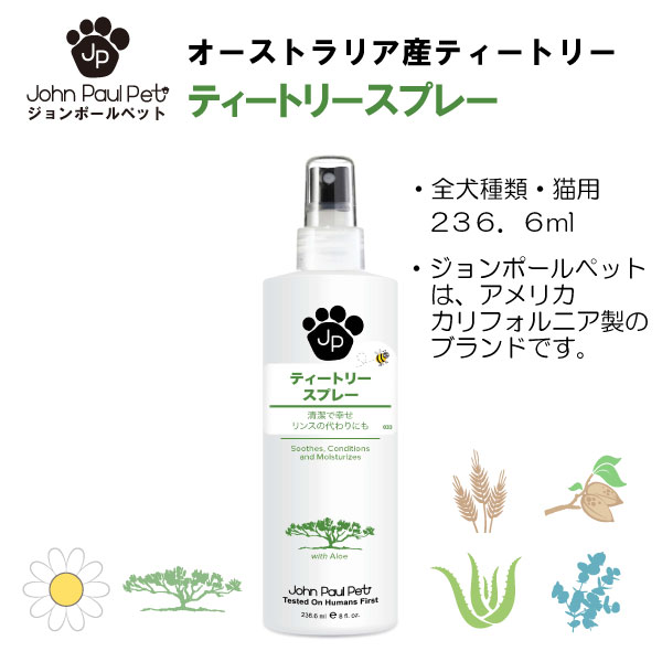 【ジョンポールペット】 正規品 ティートリースプレー 236ml 犬 いぬ 猫 ねこ イヌ ネコ ペット用 ペット用品 ケア用品 高級 トリミング 香り 皮膚ケア 清潔 ブラッシング 洗い流さない 保湿 油性肌 お手入れ ペットリンス