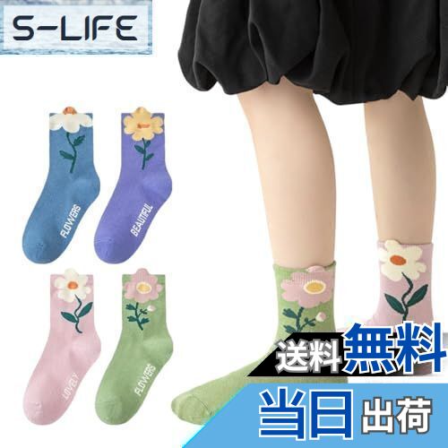 【送料無料】[ZGKULAEAOW] 靴下 女の子 クルー丈 ソックス キッズ ジュニア くつした 子供 ソックス オシャレ 花柄 四季タイプ 4足セット 色:タイプA、サイズ:15.0-17.0 cm
