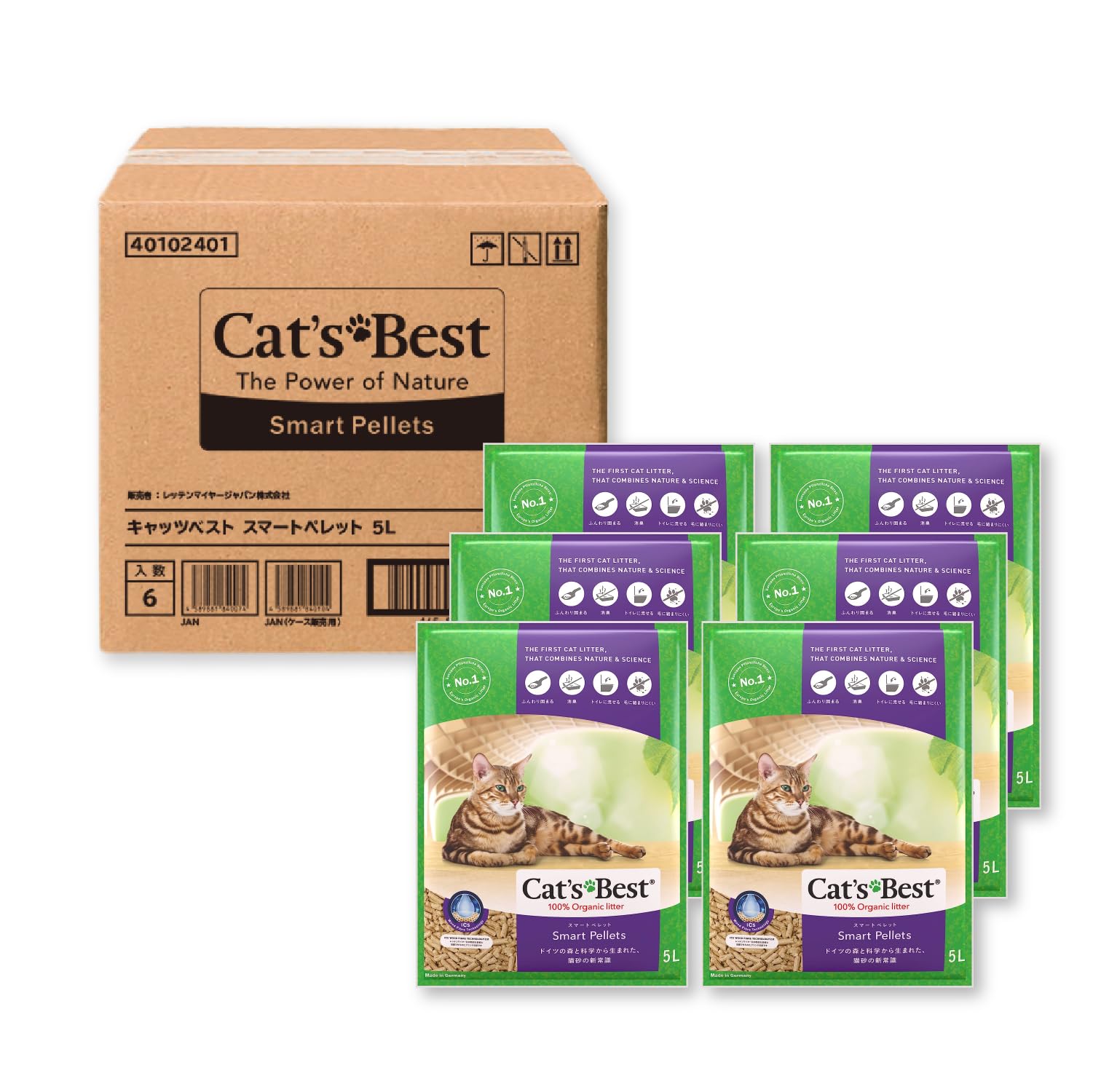 商品情報商品の説明商品紹介 CAT HYGIENE FOR A NEW AGE 猫砂から変える、猫の一生 キャッツベストはドイツの森と科学から生まれた、100%天然素材の猫砂。 1996年にドイツで販売が開始されてから20年以上、ヨーロッパでNo.1*の支持を得ています。 (*植物性猫砂のカテゴリにおいて、2016年 IRI調べ) ■キャッツベスト スマートペレット■ 猫の毛や足につきにくい形状に加工されたペレットタイプです。 猫砂の飛び散りやトイレの外に残る足跡が大幅に軽減されます。 使用上の注意 使用後は燃えるゴミとして処理できますが、処理の方法は各地域のルールに従ってください。水洗トイレに流す1回の分量は必ず45ml以下(幼児のこぶし大)にし、1度に多量に流さないで下さい。 原材料・成分 針葉樹(モミ・トウヒ)、植物性凝固剤 使用方法 ペットの体型にあった容器に5~7cm位の厚さで平らに敷き詰めます。おしっこをすると、濡れた部分が柔らかく固まります。その部分だけをスコップで取り除き、同量の猫砂を補充してください。主な仕様 本体サイズ (幅X奥行X高さ) :32×5×43cmbr本体重量:2.5kgbr原産国:ドイツ原材料:針葉樹(モミ・トウヒ)、植物性凝固剤内容量:5L