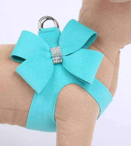 【サイズ目安】 XS:胴回り約26.5cm~約30.5cm XS/S:胴回り約29cm~約33cm S:胴回り約31.5cm~約35.5cm M:胴回り約36.5cm~約40.5cm 【素材】ウルトラスエード、スワロフスキー【洗濯方法】手洗い プラスチックバックルでカチッと留めるタイプの着脱しやすいハーネスです。 ※ベースがビミニブルー、リボンがティフィブルーになります。 リボンにシルバーのスターダストのスタッズが付いています。