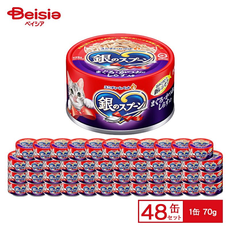 【特別SALE★12/11 1:59まで】キャットフード ユニ・チャーム 銀のスプーン 缶 まぐろ・かつお・しらす入 70g×48 ウェットフード 缶詰 水煮 ペット 成猫用1歳- ウエットフード 一般食 ミニ缶 使いやすい 便利 お魚 猫 ねこ | キャットフード