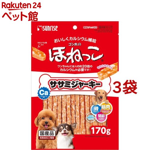 お店TOP>犬用品>犬のおやつ・サプリメント>犬のその他おやつ>SR ゴン太のほねっこ ササミジャーキー (170g*3袋セット)【SR ゴン太のほねっこ ササミジャーキーの商品詳細】●人の約20倍のカルシウムが必要な愛犬のために作られた、やわらかおいしいササミジャーキーです。【使用方法】★与え方成犬体重/1日の給与量の目安超小型犬(1〜5kg)/1〜4本小型犬(5〜10kg)/4〜7本中型犬(10〜20kg)/7〜11本大型犬(20〜40kg)/11〜19本幼犬(7カ月〜)/1〜4本※上記を参考にして1日2〜3回に分け、おやつとして与えてください。【SR ゴン太のほねっこ ササミジャーキーの原材料】肉類(鶏胸肉、鶏ササミ等)、穀類、でん粉類、食物繊維、油脂類、乳類(ミルクカルシウム等)、グルコサミン(カニ由来)、サメ軟骨抽出物(コンドロイチンを含む)、リン酸化オリゴ糖カルシウム、増粘安定剤(加工デンプン、グリセリン)、保存料(ソルビン酸カリウム)、香料、ミネラル類(焼成カルシウム、リン酸カルシウム、炭酸カルシウム)、着色料(二酸化チタン、黄4、赤40、黄5)、アミノ酸類(ロイシン、リジン、バリン、イソロイシン、スレオニン、フェニルアラニン、メチオニン、ヒスチジン、トリプトファン)、酸化防止剤(ミックストコフェロール、ローズマリー抽出物)【栄養成分】たん白質:18.0%以上、脂質:0.6%以上、粗繊維:2.0%以下、灰分:3.0%以下、水分:29.0%以下、カロリー(100gあたり):約265kcal【注意事項】・本商品は犬用です。・子供が誤食しないように、子供の手の届かないところに保管してください。・子供がペットに与えるときは、安全のため大人が監視してください。・給与量の目安をお守りください。【ブランド】ゴン太【発売元、製造元、輸入元又は販売元】マルカン サンライズ事業部※説明文は単品の内容です。リニューアルに伴い、パッケージ・内容等予告なく変更する場合がございます。予めご了承ください。・単品JAN:4973321940866マルカン サンライズ事業部583-0008 大阪府藤井寺市大井2-478-80120-64-7181広告文責:楽天グループ株式会社電話:050-5306-1825[犬用品/ブランド:ゴン太/]