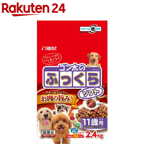 お店TOP>ペット用品>犬用食品(フード・おやつ)>ドッグフード(ドライフード・総合栄養食)>ドッグフード(高齢犬・シニア用)>SR ゴン太のふっくらソフト 11歳以上用 (2.4kg)【SR ゴン太のふっくらソフト 11歳以上用の商品詳細】●お肉のうまみがたっぷり詰まった、やわらか食感の半生タイプのドッグフードです。●ビタミンEを配合し、健康を維持することで免疫力を保つサポートをします。【使用方法】★成犬の標準給餌量成犬体重/パック数/グラム超小型犬(1〜5kg)/0.2〜0.7パック程度/50〜170g小型犬(5〜10kg)/0.7〜1.2パック程度/170〜285g中型犬(10〜20kg)/1.2〜2.0パック程度/285〜480g大型犬(20〜40kg)/2.0〜3.4パック程度/480〜810g超大型犬(40kg〜)/3.4パック〜/810g〜★上手な与え方・愛犬の健康維持に必要な栄養がバランスよく含まれていますので、毎日の食事は本製品と水だけで十分です。・新鮮な水をたっぷりと用意し、いつでも飲めるようにしてあげてください。・今までの食事に本製品を少量混ぜ、徐々に量を増やしながら1〜2週間を目安に切り替えてください。消化吸収されやすいので、便の量が少なくなることがあります。・急に新しい食事に切り替えると、便がゆるくなる事があります。【SR ゴン太のふっくらソフト 11歳以上用の原材料】穀類(小麦粉等)、肉類(チキンミール、チキンエキス、ビーフミール等)、糖類、いも類(さつまいも等)、野菜類(にんじん、かぼちゃ、ほうれん草等)、品質保持剤(プロピレングリコール)、ミネラル類(リン酸カルシウム、炭酸カルシウム、塩化カリウム、硫酸マグネシウム、塩化ナトリウム、硫酸鉄、炭酸亜鉛、硫酸銅、炭酸マンガン、ヨウ素酸カルシウム )、増粘安定剤(グリセリン)、保存料(ソルビン酸カリウム)、ビタミン類(コリン、E、C、ニコチン酸、パントテン酸、A、B6、B1、B2、葉酸、B12、D)、pH調整剤、アミノ酸類(L-リジン塩酸塩)、酸化防止剤(エリソルビン酸ナトリウム、ミックストコフェロール、ローズマリー抽出物)、着色料(二酸化チタン、黄5、赤106、黄4、青1)【栄養成分】たん白質:13.5%以上、脂質:3.4%以上、粗繊維:3.0%以下、灰分:11.0%以下、水分:33.0%以下、カロリー(100gあたり):約260kcal【規格概要】内容量:2.4kg(240g*10パック)【注意事項】・本品は犬用です。・子供が誤食しないように、子供の手の届かないところに保管してください。・子供がペットに与えるときは、安全のため大人が監視してください。・給餌量の目安をお守りください。・保存条件によってはニオイが強くなったり色や硬さが多少異なる場合がございますが、品質には問題ございませんので安心してお与えください。・まれに体調や体質に合わない場合もあります。何らかの異常に気付かれたときは与えるのをやめ、早めに獣医師に相談することをおすすめいたします。【原産国】日本【ブランド】ゴン太【発売元、製造元、輸入元又は販売元】マルカン サンライズ事業部こちらの商品は、ペット用の商品です。リニューアルに伴い、パッケージ・内容等予告なく変更する場合がございます。予めご了承ください。マルカン サンライズ事業部583-0008 大阪府藤井寺市大井2-478-80120-64-7181広告文責:楽天グループ株式会社電話:050-5577-5043[犬用品/ブランド:ゴン太/]