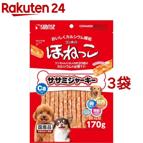 お店TOP>ペット用品>犬用食品(フード・おやつ)>犬用おやつ(ジャーキー・乾物)>ササミ・ジャーキー(犬用)>SR ゴン太のほねっこ ササミジャーキー (170g*3袋セット)【SR ゴン太のほねっこ ササミジャーキーの商品詳細】●人の約20倍のカルシウムが必要な愛犬のために作られた、やわらかおいしいササミジャーキーです。【使用方法】★与え方成犬体重/1日の給与量の目安超小型犬(1〜5kg)/1〜4本小型犬(5〜10kg)/4〜7本中型犬(10〜20kg)/7〜11本大型犬(20〜40kg)/11〜19本幼犬(7カ月〜)/1〜4本※上記を参考にして1日2〜3回に分け、おやつとして与えてください。【SR ゴン太のほねっこ ササミジャーキーの原材料】肉類(鶏胸肉、鶏ササミ等)、穀類、でん粉類、食物繊維、油脂類、乳類(ミルクカルシウム等)、グルコサミン(カニ由来)、サメ軟骨抽出物(コンドロイチンを含む)、リン酸化オリゴ糖カルシウム、増粘安定剤(加工デンプン、グリセリン)、保存料(ソルビン酸カリウム)、香料、ミネラル類(焼成カルシウム、リン酸カルシウム、炭酸カルシウム)、着色料(二酸化チタン、黄4、赤40、黄5)、アミノ酸類(ロイシン、リジン、バリン、イソロイシン、スレオニン、フェニルアラニン、メチオニン、ヒスチジン、トリプトファン)、酸化防止剤(ミックストコフェロール、ローズマリー抽出物)【栄養成分】たん白質:18.0%以上、脂質:0.6%以上、粗繊維:2.0%以下、灰分:3.0%以下、水分:29.0%以下、カロリー(100gあたり):約265kcal【注意事項】・本商品は犬用です。・子供が誤食しないように、子供の手の届かないところに保管してください。・子供がペットに与えるときは、安全のため大人が監視してください。・給与量の目安をお守りください。【原産国】日本【ブランド】ゴン太【発売元、製造元、輸入元又は販売元】マルカン サンライズ事業部こちらの商品は、ペット用の商品です。※説明文は単品の内容です。リニューアルに伴い、パッケージ・内容等予告なく変更する場合がございます。予めご了承ください。・単品JAN:4973321940866マルカン サンライズ事業部583-0008 大阪府藤井寺市大井2-478-80120-64-7181広告文責:楽天グループ株式会社電話:050-5577-5043[犬用品/ブランド:ゴン太/]