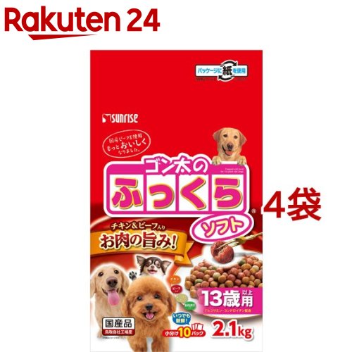 お店TOP>ペット用品>犬用食品(フード・おやつ)>ドッグフード(ドライフード・総合栄養食)>ドッグフード(高齢犬・シニア用)>SR ゴン太のふっくらソフト 13歳以上用 (2.1kg*4袋セット)【SR ゴン太のふっくらソフト 13歳以上用の商品詳細】●お肉のうまみがたっぷり詰まった、やわらか食感の半生タイプのドッグフードです。●関節の健康維持に配慮してグルコサミン・コンドロイチンを配合しました。【使用方法】★成犬の標準給餌量成犬体重/パック数/グラム超小型犬(1〜5kg)/0.2〜0.8パック程度/50〜170g小型犬(5〜10kg)/0.8〜1.4パック程度/170〜285g中型犬(10〜20kg)/1.4〜2.3パック程度/285〜480g大型犬(20〜40kg)/2.3〜3.8パック程度/480〜810g超大型犬(40kg〜)/3.8パック〜/810g〜★上手な与え方・愛犬の健康維持に必要な栄養がバランスよく含まれていますので、毎日の食事は本製品と水だけで十分です。・新鮮な水をたっぷりと用意し、いつでも飲めるようにしてあげてください。・今までの食事に本製品を少量混ぜ、徐々に量を増やしながら1〜2週間を目安に切り替えてください。消化吸収されやすいので、便の量が少なくなることがあります。・急に新しい食事に切り替えると、便がゆるくなる事があります。【SR ゴン太のふっくらソフト 13歳以上用の原材料】穀類(小麦粉等)、肉類(チキンミール、チキンエキス、ビーフミール等)、糖類、いも類(さつまいも等)、緑茶、酵母抽出物、グルコサミン(カニ由来)、サメ軟骨抽出物(コンドロイチンを含む)、魚介類、果実類、野菜類(にんじん、かぼちゃ、ほうれん草等)、品質保持剤(プロピレングリコール)、ミネラル類(リン酸カルシウム、炭酸カルシウム、塩化カリウム、硫酸マグネシウム、塩化ナトリウム、硫酸鉄、炭酸亜鉛、硫酸銅、炭酸マンガン、ヨウ素酸カルシウム )、増粘安定剤(グリセリン)、保存料(ソルビン酸カリウム)、ビタミン類(コリン、E、C、ニコチン酸、パントテン酸、A、B6、B1、B2、葉酸、B12、D)、pH調整剤、アミノ酸類(L-リジン塩酸塩)、酸化防止剤(エリソルビン酸ナトリウム、ミックストコフェロール、ローズマリー抽出物)、着色料(二酸化チタン、黄5、赤106、黄4、青1)【栄養成分】たん白質:13.5%以上、脂質:3.4%以上、粗繊維:3.0%以下、灰分:11.0%以下、水分:33.0%以下、カロリー(100gあたり):約260kcal【規格概要】内容量:2.1kg(210g*10パック)【注意事項】・本品は犬用です。・子供が誤食しないように、子供の手の届かないところに保管してください。・子供がペットに与えるときは、安全のため大人が監視してください。・給餌量の目安をお守りください。・保存条件によってはニオイが強くなったり色や硬さが多少異なる場合がございますが、品質には問題ございませんので安心してお与えください。・まれに体調や体質に合わない場合もあります。何らかの異常に気付かれたときは与えるのをやめ、早めに獣医師に相談することをおすすめいたします。【原産国】日本【ブランド】ゴン太【発売元、製造元、輸入元又は販売元】マルカン サンライズ事業部こちらの商品は、ペット用の商品です。※説明文は単品の内容です。リニューアルに伴い、パッケージ・内容等予告なく変更する場合がございます。予めご了承ください。・単品JAN:4973321940798マルカン サンライズ事業部583-0008 大阪府藤井寺市大井2-478-80120-64-7181広告文責:楽天グループ株式会社電話:050-5577-5043[犬用品/ブランド:ゴン太/]