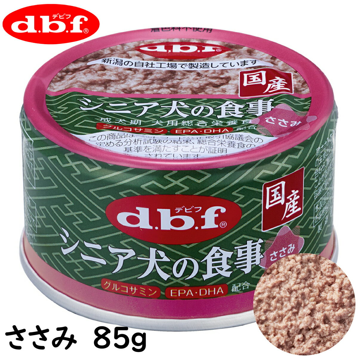 【最大2000円OFFクーポン配布】デビフ シニア犬の食事 ささみ 85g 老犬 介護食 ウェットフード 犬の缶詰 [d.b.f デビフ] 老犬の健康に配慮した、鶏ささみベースの総合栄養食です。 シニア犬の食事【ささみ】鶏ささみのミンチを食べやすいやわらかさに仕上げています。高齢期の健康に配慮して、EPA・DHA、グルコサミンを配合しました。■原材料鶏ささみ、鶏肉、鶏レバー、砂糖、大豆油、食塩、EPA・DHA含有精製魚油、グルコサミン塩酸塩、増粘多糖類、ミネラル類、ビタミン類■保証成分たんぱく質 8.5%以上、脂質 3.0%以上、粗繊維 1.0%以下、灰分 2.0%以下、水分 83.0%以下、ナトリウム 0.22%以下、代謝エネルギー 85kcal/100g■原産国日本 11
