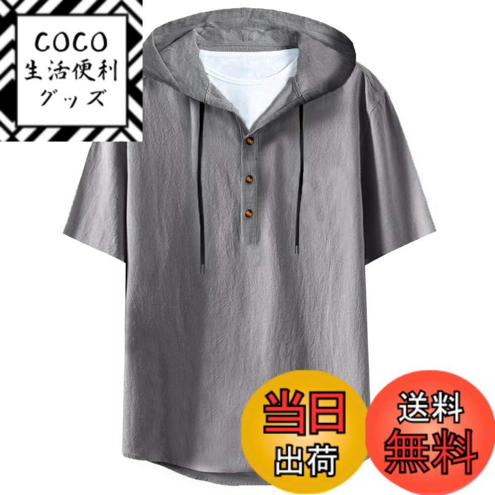 【送料無料】[EASTEMPO] パーカー メンズ 半袖 夏 薄手 ゆったり 綿麻 無地 大きいサイズ 色:グレー、サイズ:2XL