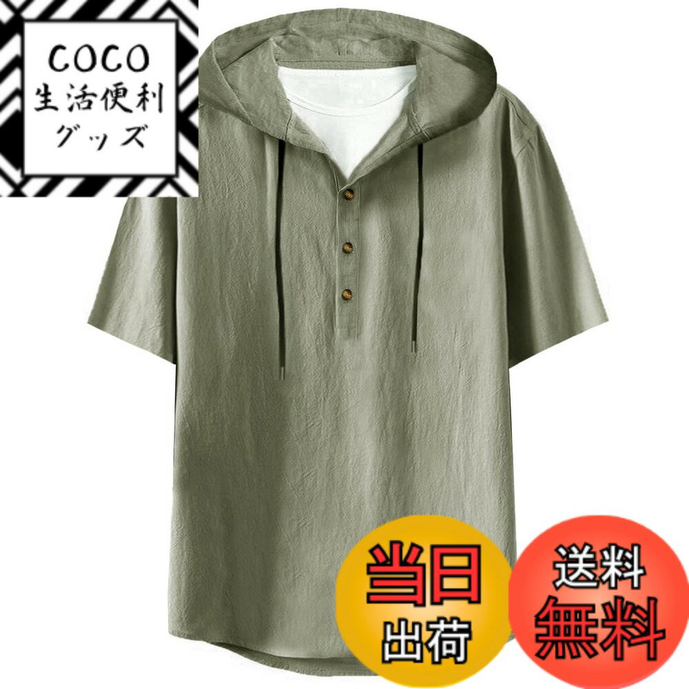 【送料無料】[EASTEMPO] パーカー メンズ 半袖 夏 薄手 ゆったり 綿麻 無地 大きいサイズ 色:グリーン、サイズ:3XL