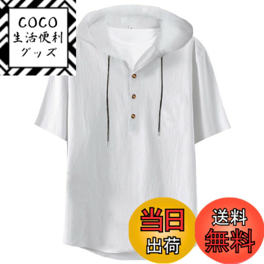 【送料無料】[EASTEMPO] パーカー メンズ 半袖 夏 薄手 ゆったり 綿麻 無地 大きいサイズ 色:ホワイト、サイズ:XL