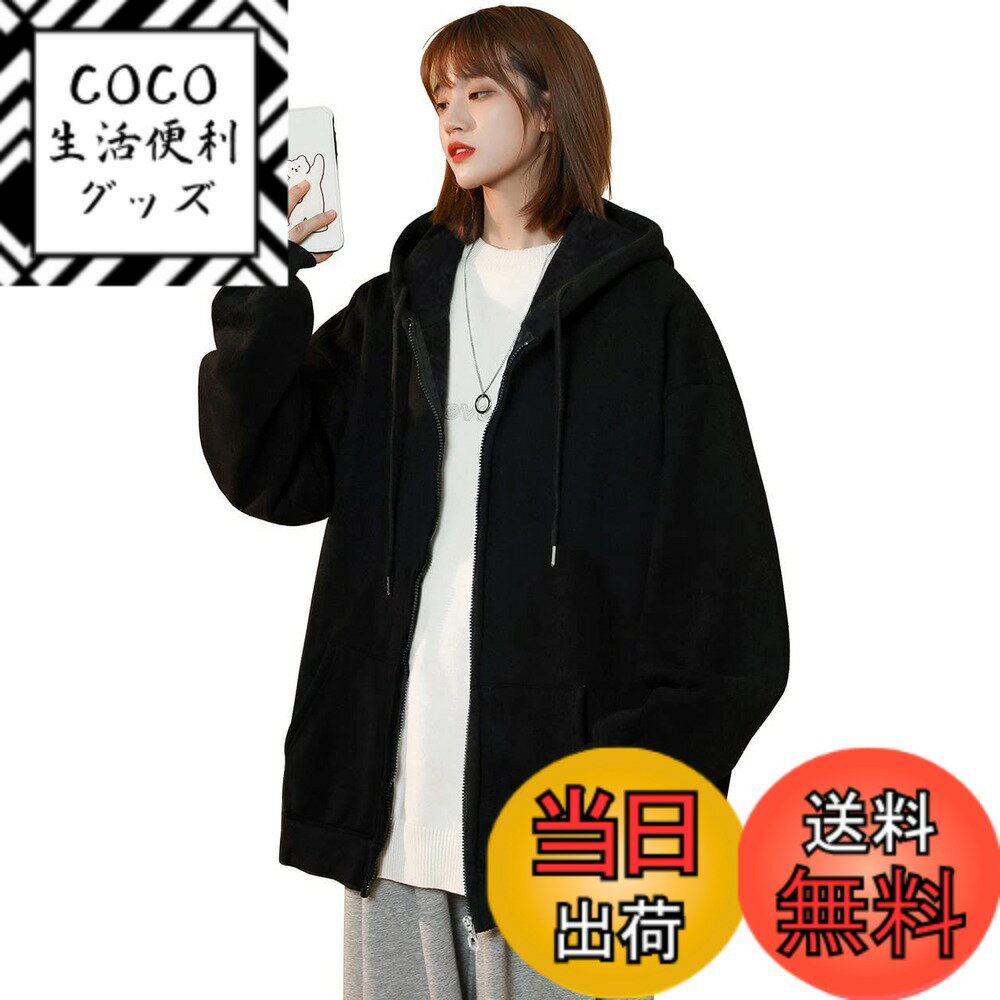 【送料無料】[EASTEMPO] パーカー レディース 長袖 秋冬 裏起毛 ジップアップ ゆったり 無地 おしゃれ 大きいサイズ 色:ブラック、サイズ:M
