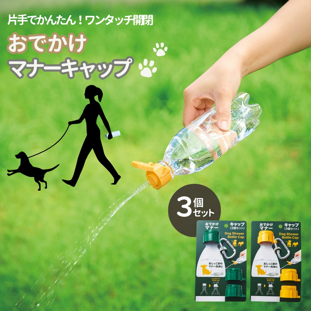 おでかけマナーキャップ(3個セット)| ワンちゃん お散歩 散歩 おしっこ洗浄 ハンディシャワー 水 流す 散水 ペット 犬 イヌ いぬ マナー 軽量 ワンタッチ 片手 かた手 ペットボトル カラビナ イエロー グリーン キャップ フタ ジョウロ