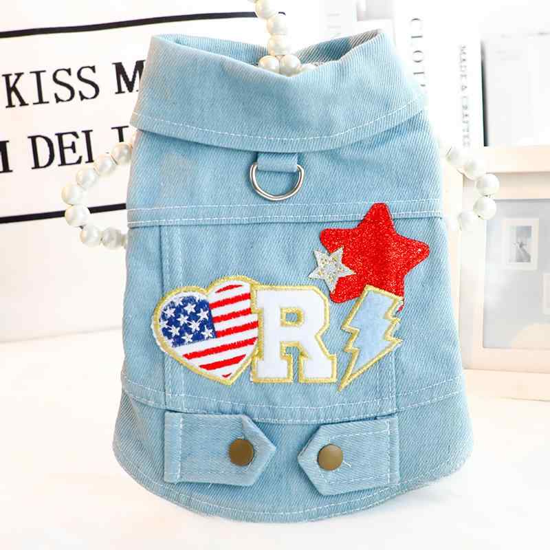 犬猫兼用 ペット服 小型犬 トイプードル リード装着可能 デニム ベスト 星柄 スター 刺繍 カジュアル おしゃれ 春夏秋冬 ブルー 青 XS-XLサイズ お散歩 お出かけ