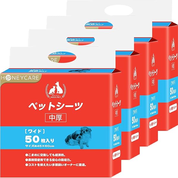 HONEYCARE ハニーケア ペットシーツ 中厚型 レギュラー 100枚x4袋(400枚) (ワイド 50枚x4袋(200枚))ブランドHONEY CARE色ホワイトモデル商品説明【商品概要】本商品「ハニーケア ペットシーツ」は中厚型ですが、多層構造を採用したため、オシッコをたっぷり吸収いただけます。【商品説明】1 本商品「ハニーケア ペットシーツ」は中厚ですが、多層構造を採用したため、オシッコをたっぷり吸収いただけます。 2 レギュラー・ワイド・スーパーワイドで3つのサイズを用意したので、小型犬(子猫)から中型・大型犬までに対応いただけます。 3 瞬間吸収・逆戻りにくい・におわない・高品質原材料などの革新的な技術で品質グレードをアップいたします。 4 こだわりの多層構造でオシッコを吸収し、しっかりとキープするため、漏れにくくなります。 5 お得な大容量のため、一枚当たりの単価が安くて、気軽に使用しやすいでございます。【商品詳細】ブランド:HONEY CARE商品種別:犬用トイレシート商品名:HONEYCARE ハニーケア ペットシーツ 中厚型 レギュラー 100枚x4袋(400枚) (ワイド 50枚x4袋(200枚))製造元:U-PLAY CORPORATION商品内容:ワイド 50枚x4袋(200枚)色:ホワイト【当店からの連絡】