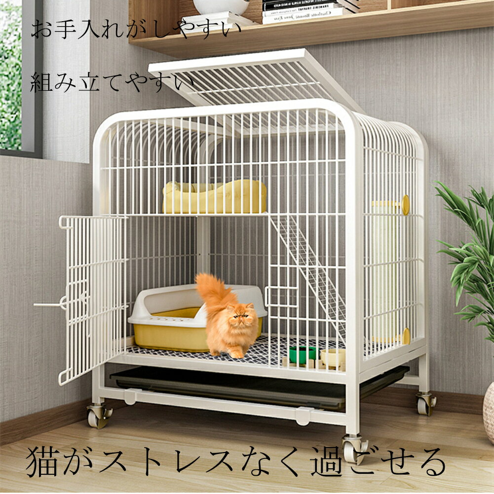【商品サイズ】商品2段のサイズ:横幅71cm×奥行54cm×高さ75cm キャスター付きなので、掃除の時は移動楽々になります。4つのキャスターに全部ストッパーがあり、安定性にもご心配ないです。使用時にはケージが動かないようにロックすることができます。 【掃除しやすい引出式トレー】トレーが深く、猫砂がこぼれにくいので安心です。食べこぼし、いたずらをしてもお部屋の床を汚さないトレー形状です。トレー全体がケージから取り外せるので、掃除には便利です。スペースも十分あるので、トレーに猫ソファ、猫トイレ、食き台などをどんどん入れてもOKです。 【大型のネコちゃんでも広々快適】十分なスペースがあり、ケージにトイレ、クッション、おもちゃや水飲み器などのアイテムを設置ことができ、留守番中時にも猫ちゃんがケージの中でのんびりでリラックスで過ごせて、窮屈な思いをさせません。 【スライド式ロック】猫が脱走してしまうのを防ぐためにつまんで開閉するロックを使用し、猫ちゃんのイタズラ開きを防止できます。ケージ全体も頑丈に作られているので、脱走の心配もなく、留守番をさせることができます。