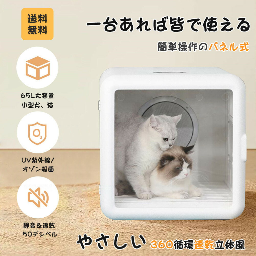 【ドライヤーの悩みはこれで解決】ペットの大きさや状態に合わせて温度(20~45℃)、風量(4段風速)、タイマー(5~90min)を簡単に設定することができます。 【全身しっかり乾燥】ペットドライハウスは底面から温風を吹き込み、室内を360度循環、温風がペットの体全体を優しく包み込み、乾きにくいお腹や足、しっぽまでムラなく乾燥します、短時間でドライ完了。 【過熱保護&お掃除簡単】高精度温度センサーを内蔵し、温度が一定温度を超えると自動的に電源が切れます。またドライハウスはUV除菌装置も搭載、ペットの毛を乾かした時に残った水滴や毛に付着した雑菌類を紫外線で除菌、ペットのおもちゃや衣類の消毒や乾燥に使える。 【まるでサロンのような仕上がりに】ペットをお風呂に入れた後、特に面倒なことは濡れた毛を乾かすことです。このペットドライハウスなら効率的に乾かすことができ、両手を解放できます。ペット ドライルームは65Lの大容量で、重さは12.5kgまで対応できるので、猫2匹或いは小型犬を入れても窮屈にならず、ペットは寝返りを打ったりと自由に動くことができます。*長さ:455mm 幅:約552mm、高さ:約458mm。