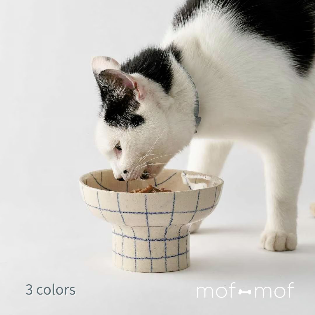 [Super Ceramics] フードボウル グリッド/ライン/ブラッシュ フランス人陶芸家シャーロットさん制作の高さのあるフードボウル -高さがあることで気管に負担なく食事ができます -ベージュやオフホワイトにブルーの模様がどんなインテリアにもマッチ -なんならパンやフルーツを乗せてインテリアアイテムとしても使えます -磁器と陶器のいいとこどりのストーンウェア採用 -陶器のように土を使い、磁器のように高温で焼き上げることで、空気穴が少なく、水や油を弾き、耐久性の高さを実現 -釉薬(うわぐすり)をかけているので、汚れも取れやすく、洗いやすい -重量350グラム、持っても重すぎず、倒れにくい -電子レンジ、食洗機もOKです -猫と小型/中型犬用 -ウェットもドライフードも使えます -グリッド=ベージュに透明の釉薬、グリッドの模様 -ライン=ベージュに白の釉薬、細いライン(一番白いです) -エアブラッシュ=ベージュに透明の釉薬、エアブラシのグリッド模様 -フランス産、直輸入 -モデルを務めているのはシャーロットさんの愛猫ムシュさん -動画に出演しているのは我が家の柴犬とトイプードルです -工業製品ではありません。自然の土を使い、成型から絵付けなど全工程手作りの陶芸品です。色むらや塗り残し、裏も少しぼこぼこしています -絵の書き方や大きさなど個体差もあります -ご了承いただいた上でご購入ください 【Super Ceramics】 陶芸家のCharlotte Talbotさんがフランスのアトリエで、全て一人で制作しています。どこか懐かしさを感じる優しいデザインをクレイ(粘土)を使って表現しています。マグカップやお皿も素敵で欲しくなっちゃいます。 サイズ 個体差もあるので大体こんな感じです。 直径 約14 cm ボウルの高さ 約 3.5 cm 全体の高さ 約 8-9 cm 重量 約 350 グラム
