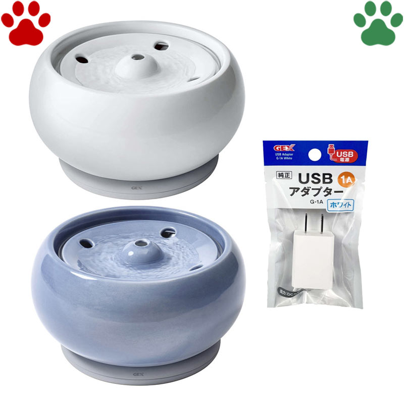 [セット] GEX ピュアクリスタル セラモ 1.8L ホワイト / ブルー + 純正 USBアダプター G-1A ホワイト犬猫兼用 自動給水器 獣医師推奨 フィルター式 循環式 給水器 陶器 セラミック 軟水 大容量 シンプル おしゃれ 白 青 ceramo ジェックス