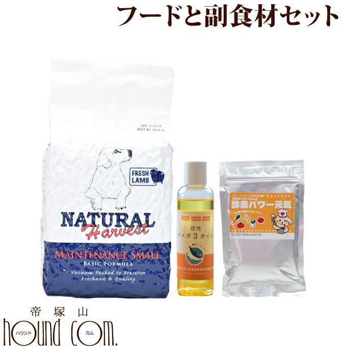 ※1 常温品と冷凍品混在時は11000円以上で送料無料 ※2 沖縄・北海道は11000円以上で通常送料無料、常温混在時は22000円以上で送料無料となります。 ※3 ただし在庫有りの商品に限る。土曜日は12時までとなります。 ※4 定休日:日曜日・第1第3土曜日・祝日となります。 ■お支払方法について ■購入後も安心の返品・交換について ■送料やお届け目安について ■会社概要 メンテナンススモール&手作り食セット 成犬用からシニア犬用総合栄養食と人気の副食材のお手軽セット。 【セット内容】 ナチュラルハーベスト メンテナンススモール(フレッシュラム) 1.59kg×2袋 活性オメガ3オイル 酵素パワー元気 100g×3袋 【メンテナンススモール(フレッシュラム)】 ・内容量:2袋〔1.59kg×2袋〕 ・原産国:米国 ・カロリー:320kcal/100g ・原材料:ラム生肉(Fresh Lamb)、ラムミール、精製白米、えんどう豆繊維、えんどう豆タンパク質、鶏脂肪(ビタミンEで酸化対策済)、亜麻仁、ビール酵母、加水分解チキンエキス、リン酸カルシウム、塩化カリウム、海塩、ブルーベリー、クランベリー、タウリン、アシドフィルス菌、カゼイ菌、フェシウム菌、月見草油(低温圧搾)、キレート亜鉛、グルコサミン塩酸塩、コンドロイチン硫酸塩、ビタミンE、キレート鉄、ベタイン、キレートマンガン、キレート銅、ビタミンA、ナイアシン、パントテン酸カルシウム、ベータカロテン、ビタミンB12、ビタミンD3、リボフラビン、塩酸ピリドキシン、硝酸チアミン、ビオチン、ヨウ化カルシウム、酸化防止剤(ローズマリー抽出物)、葉酸 ・保証分析値:粗タンパク質:18%以上、粗脂肪:8%以上、粗繊維/4%以下、粗灰分:6%以下、水分:10%以下 【活性オメガ3オイル】 ・内容量:100ml ・カロリー:899.1kcal/100g ・原材料:バチ鮪、ビンチョウ鮪 頭部 ・成分:オメガ3(DHA26.07g/100g・EPA6.38g/100g)、ビタミンD46.5μg/100g、ビタミンE51.3mg/100g、過酸化物価2.8meq/kg 【酵素パワー元気】 ・内容量:100g×3袋 ・原産国:日本 ・カロリー:344kcal/100g ・原材料:植物エキス発酵液工程原料(上白糖、リンゴ、ニンジン、ダイコン、キャベツ、セロリ、キュウリ、バナナ、タマネギ、ゴボウ、ホウレンソウ、ナシ、ミカン皮、トマト、ピーマン、リョクトウモヤシ、ナス、レンコン、カボチャ、生シイタケ、ショウガ、レタス、ニンニク、ミツバ、ウド、アスパラ、食塩、クマザサ、クローバー、コンブ、フキノトウ、タンポポ、オオバコ、エンドウモヤシ、スギ葉、パセリ、カブ、パイン、ブドウ、イチゴ、イタドリの若芽、アサツキ、ハクサイ、エノキタケ、サラダナ、シュンギク、ヨモギ、セリ、ニラ、トドマツ葉、アオシソ、ワカメ)、調整基材(ビートパルプ・植物エキス発酵原液) ・成分: 水分 4.9% / 粗灰分 3.5% / 粗タンパク質 5.8% / 炭水化物 78.5% / 粗脂肪 0.8% / ナトリウム 0.3g / 粗繊維 6.5% / > ■配送方法 佐川急便 ■送料について のみ → 5500円以上送料無料 のみ → 5500円以上送料無料 ※沖縄・北海道・一部離島は11000円以上 +同時注文 → 11000円以上送料無料 ※沖縄・北海道・一部離島は22000円以上 冷凍商品と常温商品の同梱は出来ません。 送料表の常温品+冷凍品の料金をご参照ください。 ※金額変更の場合がございます。 クール便代や常温・冷凍同時注文の際の追加送料など、ご注文後に金額修正をする場合がございます。 詳しくは【送料について】をご一読くださいませ。ナチュラルハーベスト メンテナンススモール(フレッシュラム) 1.59kg×2袋 活性オメガ3オイル 酵素パワー元気 100g×3袋