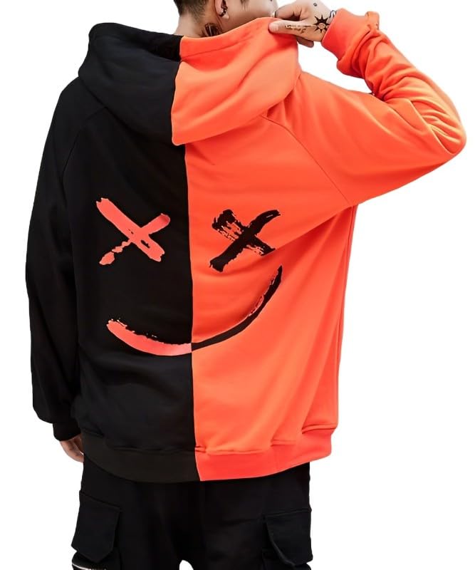 【送料無料】[Four leaf] 【薄手で裏起毛】 パーカー メンズ プルオーバー バイカラー 裏起毛 秋 冬 春 秋冬 スマイル 長袖 フード付き トレーナー プリント カジュアル アシンメトリー スウェット 薄手 軽量 色:黒オレンジ、サイズ:M