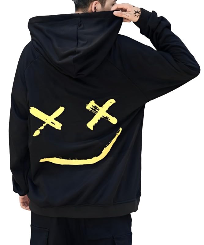 【送料無料】[Four leaf] 【薄手で裏起毛】 パーカー メンズ プルオーバー バイカラー 裏起毛 秋 冬 春 秋冬 スマイル 長袖 フード付き トレーナー プリント カジュアル アシンメトリー スウェット 薄手 軽量 色:ブラック、サイズ:L