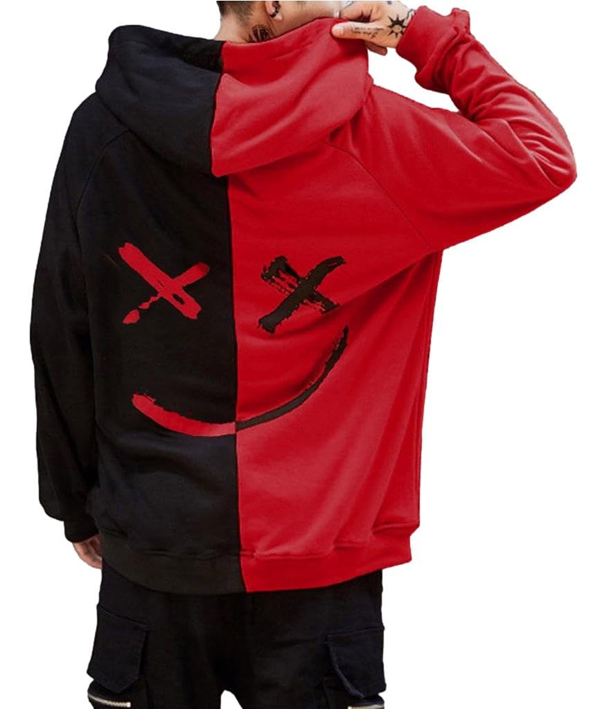 【送料無料】[Four leaf] 【薄手で裏起毛】 パーカー メンズ プルオーバー バイカラー 裏起毛 秋 冬 春 秋冬 スマイル 長袖 フード付き トレーナー プリント カジュアル アシンメトリー スウェット 薄手 軽量 色:黒紅、サイズ:3L