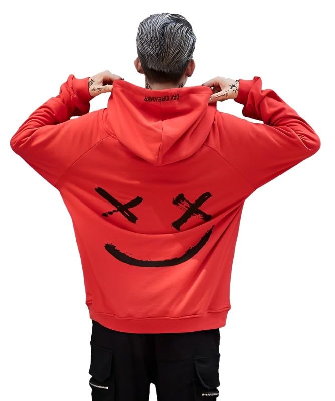 【送料無料】[Four leaf] 【薄手で裏起毛】 パーカー メンズ プルオーバー バイカラー 裏起毛 秋 冬 春 秋冬 スマイル 長袖 フード付き トレーナー プリント カジュアル アシンメトリー スウェット 薄手 軽量 色:レッド、サイズ:L