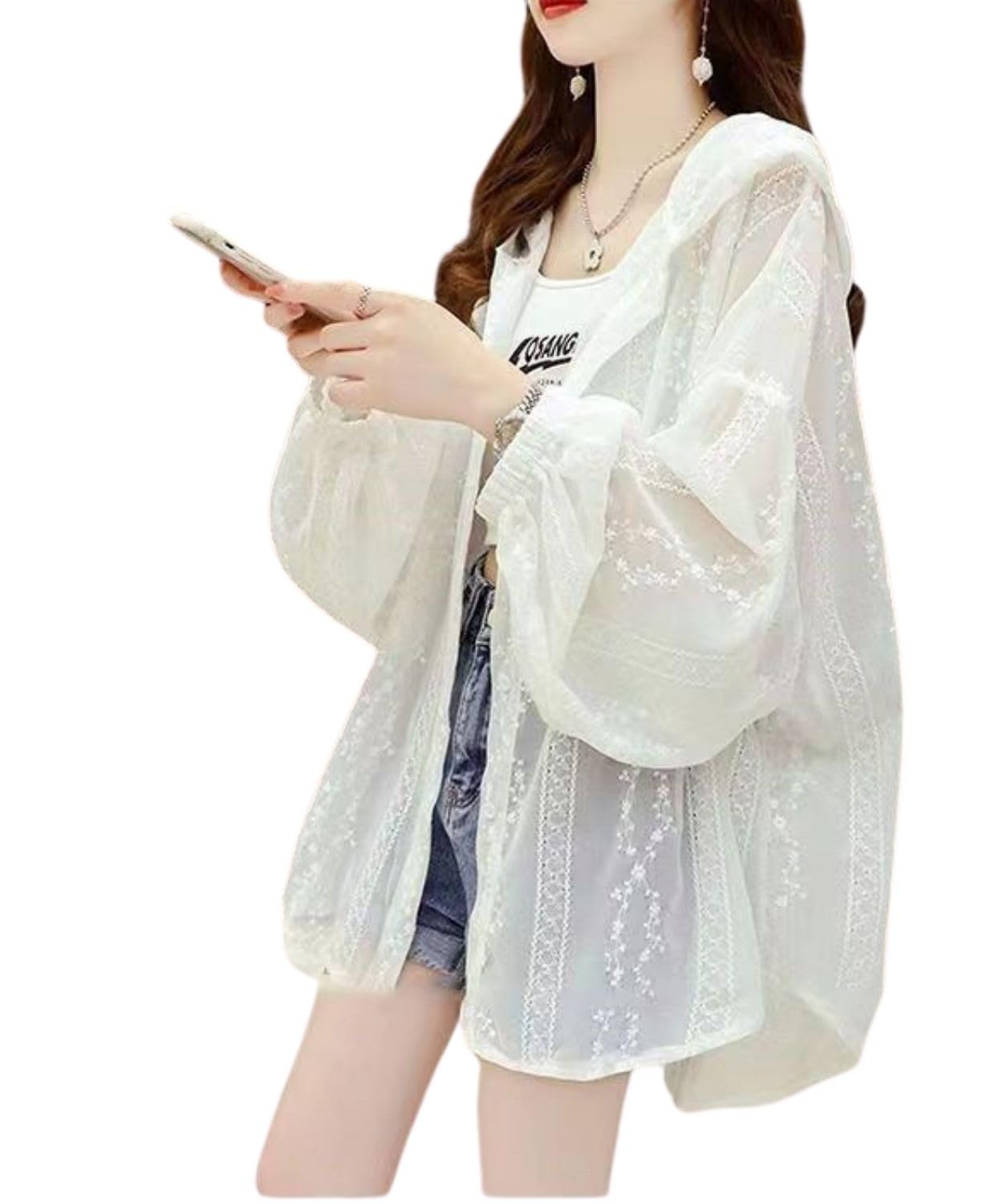 【送料無料】[Four leaf] 可愛い シアートップス レディース 夏 シアーパーカー シアーシャツ カットソー レース カーディガン 冷房対策 日焼け対策 uvカット ゆったり 体型カバー 色:ホワイト、サイズ:L