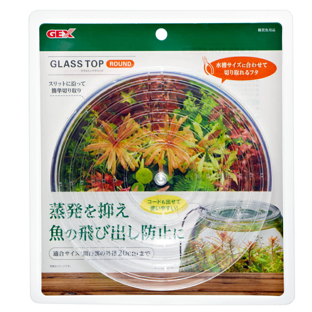 ジェックス GEX AQUARIUM グラストップラウンド グラスアクア用 金魚鉢 円形水槽 プラフタブランドジェックス色透明モデル4972547041005商品説明【商品概要】蒸発を抑え、魚の飛び出し防止に グラスアクアや金魚鉢等の円形水槽の開口部に乗せて、水の蒸発を抑え、魚の飛び出しを防止するプラスチックフタです。湿度が維持でき、コケリウムにも最適。お持ちの水槽サイズに合わせ、スリットに沿って簡に切り取って使用できます。光を通すクリアタイプ。メンテナンスしやすい取っ手付き。コードを通す隙間も作れて使いやすい!【適合サイズ】開口部の外径20cmまで。【切断時サイズ】約18cm(シリンダー)、16cm、14cm(ドロップ)、12cm(ティアー・スフィア)、10cm(キャンドル)、8cm、6cm。【切り取り方法】本製品ははさみやカッター等では切り取りにくいため、市販のニッパー等で、切り残しがないように注意しながら切り取ってください。※切り取る際に手等をケガしないよう充分ご注意ください。【使用上の注意】本製品を切り離した切断面は鋭利になることがありますので、その場合は断面をやすり等で調整してください。本製品は開口部が斜めのものや、円形でないものには使用できません。水垢や汚れは定期的に掃除を行ってください。【商品説明】【商品詳細】ブランド:ジェックス商品種別:水槽 (ペット用品)商品名:ジェックス GEX AQUARIUM グラストップラウンド グラスアクア用 金魚鉢 円形水槽 プラフタ製造元:ジェックス商品番号:4972547041005発売日:2022年02月17日色:透明商品タイプ:Aquarium【当店からの連絡】
