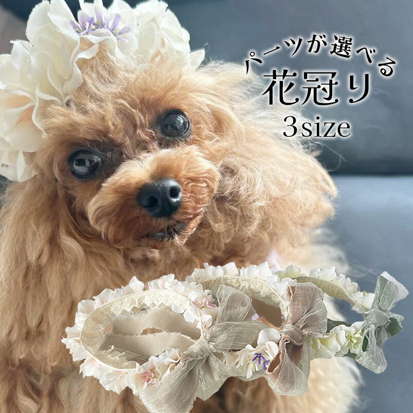 花冠 犬 帽子 飾り 小型犬 りぼん 中型犬 結婚式 誕生日 犬服 頭飾り 【3サイズ くすみリボン花冠り】 dog pet 猫 ねこ リングドッグ ヘアアクセサリー パピー 仔犬 かわいい 結婚式 誕生日 撮影会 チワワ プードル ミニチュアダックスフンド お花畑 犬グッズ オメカシペット ミルクベースのシンプルなお花とリボンのはなかんむり。上品な花冠です。選べるパーツで簡単に装着可能。お誕生日や結婚式のリングドッグ・おそろいギフトにも。 ミルキーなあじさいのシンプルな花冠に、小花を混ぜました。花部分はシンプルに、リボンに存在感を出しました。くすみリボンは国産コットンリネンリボンです。クシュクシュ加工のシフォンリボンとダブルリボン仕様です。大きなリボンが可愛らしい花かんむりです。コードストッパー付きゴム:約20cm首にゴムを通して花冠を安定して装着出来ます。ゴムが長い場合はストッパー下の垂れる部分をカットしてご利用下さい。レース:お好きな長さに結んでください。Sサイズ:花部分全長:20cmMサイズ:花部分全長:28cmLサイズ:花部分全長:35cm取れにくく実用的ですので、撮影用としてだけではなく、記念日やお出かけなどにもお使い頂けます。<取り扱い注意事項>- お花は染料が落ちる事があるため、水濡れにはご注意ください。- 直射日光や高温多湿の場所に長時間放置しないでください。- サイズに合わせて正確に装着してください。装着が緩くなったり、壊れたパーツがある場合は、危険なので使用しないでください。【関連カテゴリー】ペットアクセサリー ドッグアクセサリー ドッグチョーカー わんこ撮影会 猫 ねこ 兎 ウサギ ペットアクセサリー ペット花冠 ペット用はなかんむり おうちフォト ペットフォト フォトスタジオ フォトグラファー うちの子記念日 犬用 猫用 ウサギ用 2