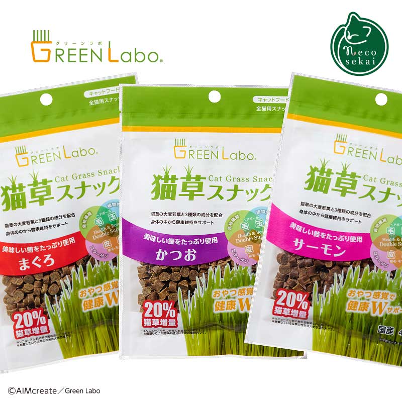 GreenLabo 猫草スナック まぐろ/かつお/サーモン【猫用おやつ】【おやつ スナック トリーツ フード ねこ草 ネコ草 キャットグラス 健康食 毛玉 ヘアボール 猫 ねこ ネコ 子猫 】