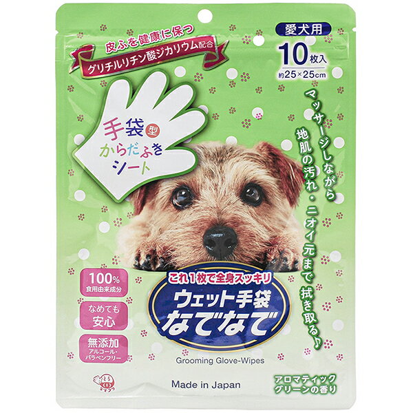 これ1枚で全身スッキリ!・マッサージしながら全身をすっきりできる手袋型からだふきシートです。・左右対称の手袋でスキンシップしながらケアできる。・地肌の汚れ、ニオイ元までしっかり拭ける。・グリチルリチン酸ジカリウム、アロエエキス配合で皮ふ、被毛を健やかに保つ。・100%植物由来成分でなめても安心。(アルコール・パラベン無添加)・ アロマティックグリーンの香りでペットもリラックス。原材料(成分):【成分】水、PG、安息香酸Na、クエン酸、グレープフルーツ種子エキス、ポリソルベート20、グリチルリチン酸2K、シクロデキストリン、アロエベラ葉エキス、ドクダミエキス、クエン酸Na、オリーブ油、香料【素材】レーヨン、PP、PET原産国または製造地:日本商品使用時サイズ:寸法:約25×25cm保管方法:・乾燥を防ぐため、ご使用後はきちんとチャックを閉めて保管し、早めに使い切ってください。・一度袋から取り出した手袋は袋に戻さないでください。・乳幼児の手の届かないところに保管して下さい。・直射日光や高温多湿を避けて保管して下さい。諸注意:・ペットの肌に異常がある場合、肌に合わない場合は直ちにご使用をお止めください。・ペットの目・鼻・口に入らないように注意してください。・この商品は水に溶けませんので、トイレには流さないでください。・本製品の使用は予告なく変更する事があります。・原料由来の異物が付着していることがあります。品質には問題ありません。