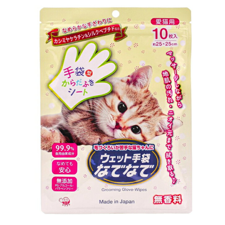 毛づくろいが苦手な猫ちゃんに・カシミヤケラチン(*被毛コート成分)で柔らかく、しなやかな感触に。・シルクペプチド(*被毛コート成分)で被毛の保護、ハリとコシを与える。・においに敏感な猫にやさしい無香料タイプ・左右対称の手袋でスキンシップしながらケアできる。・地肌の汚れ、ニオイ元までしっかり拭ける。・なめても安心。(PG、アルコール、パラベン無添加)原材料(成分):【成分】水、PG、安息香酸Na、グレープフルーツ種子エキス、クエン酸、加水分解ケラチン(カシミヤヤギ)、シルクペプチド、ポリ-ε-リシン、クエン酸Na、シクロデキストリン【素材】レーヨン、PP、PET原産国または製造地:日本商品使用時サイズ:約24×25cm使用方法:・本品を使用前によくブラッシングし、被毛のもつれをほぐしてください。・袋を開封して手袋を1枚ずつ取り出してください。・手袋を手にはめて愛犬の体を拭いてください。・使用後は水洗いやふき取りは不要です。・必要に応じてブラシで毛並を整えてください。・左右対称なので両面お使いいただけます。保管方法:・乾燥を防ぐため、ご使用後はきちんとチャックを閉めて保管し、早めに使い切ってください。・一度袋から取り出した手袋は袋に戻さないでください。・乳幼児の手の届かないところに保管して下さい。・直射日光や高温多湿を避けて保管して下さい。諸注意:・ペットの肌に異常がある場合、肌に合わない場合は直ちにご使用をお止めください。・ペットの目・鼻・口に入らないように注意してください。・この商品は水に溶けませんので、トイレには流さないでください。・本製品の使用は予告なく変更する事があります。・原料由来の異物が付着していることがあります。品質には問題ありません。