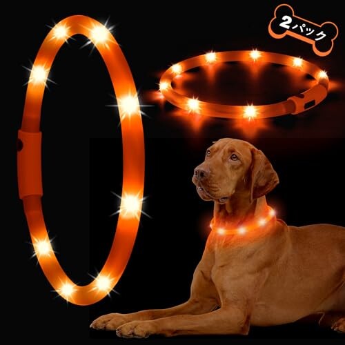 Illumifun 2個セットの光る犬用首輪、USB充電式で夜間散歩用の光る首輪。視認距離は500mで。小型犬、中型犬、大型犬に対応。(オレンジ色)