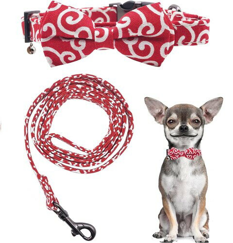 JpGdn 犬首輪リードセット 犬 猫首輪 お洒落 唐草模様 リボンリード ドッグ 和柄 柔らかい 首輪+リード+鈴のセット レッド L