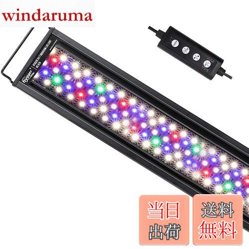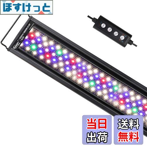 商品情報商品の説明主な仕様 【最新の機能:24/7モード】24時間の自動調光機能により、朝焼けから深夜にいたるまでの太陽の光を再現してくれます。この水槽用ライトは、日の出の暖かいオレンジ色のライトから正午の明るいフルスペクトルライト、夜間の星空の青いライトまで、水草の成長や魚の生活リズムに合わせて光をシミュレーションして、自然の生活条件を再現します。デフォルトのライトは午前6時に自動オン、22:30に自動オフになります。br【超防水・高輝度LED】01水深1mの水に30分沈んでも復活できる防水性があります!02水槽ライトは耐久性のある18W高輝度LEDを採用して、色温度は7000Kで、ライト1800lmの明るさがあります。完全な色比率により、フルスペクトルを実現して、太陽光を再現した高品質の水槽ライト。450から660nmまでの波長を発する性能を備えため、この1台で水草用や海水用、または水をクリアに見せたい、金魚をキレイに見せたいといったさまざまな要望にこたえられます。br【タイマー付き】LED水槽ライトは6時間/10時間/12時間3段階節電タイマーを設定できます。水草の成長や魚の生活リズムに合わせて光を調節できるため便利です。夜間や外出時の使用にも役立ちます。電気代を大幅カットできます!デフォルト機能も付き、電源がOFF状態と電源切で再起動すると、元の設置状態に戻り、再設置不要で、すごく便利です。ご注意:タイマーモード終了後、LEDライトは弱い明るさのままです。br【点灯モードと明るさ調整可能】。リモコンで光の色合いを自在に操れます。カラー オン-オフ/ M ポタン水槽用照明ライトは白・赤・橙・黄・緑・青・藍の7種類の色の58/98個LEDビーズがある、循環点灯・カラー点灯・全点灯の3つの照明モードの変更で、水槽内を幻想的な空間に彩ります。輝度(▲/▼ ポタン)また、5段階で光の明るさを調整できます。さまざまな照明効果を調整して、なかには光の変化を工夫することで成長しやすい水草や、産卵しやすくなる魚もいます。ご注意:翌日、ライトは15分以内にゆっくり設定した明るさに達します。br【長寿命・便利・安全】01アクアリウムライトは収縮可能なブラケットを使って、 75~90cmの水槽に対応しています。02抗酸化性に優れ、使用寿命60000時間のLEDライトの安定した仕様も保障します。03分離可能なアダプターは、再利用できます。 04水槽用ライトは散熱性の高いアルミ合金を主体としており、スムーズな散熱を保証します。