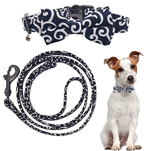 JpGdn唐草模様首輪リードセット犬猫首輪お洒落リボンリードドッグ和柄柔らかい首輪+リード+鈴のセットネイビーL