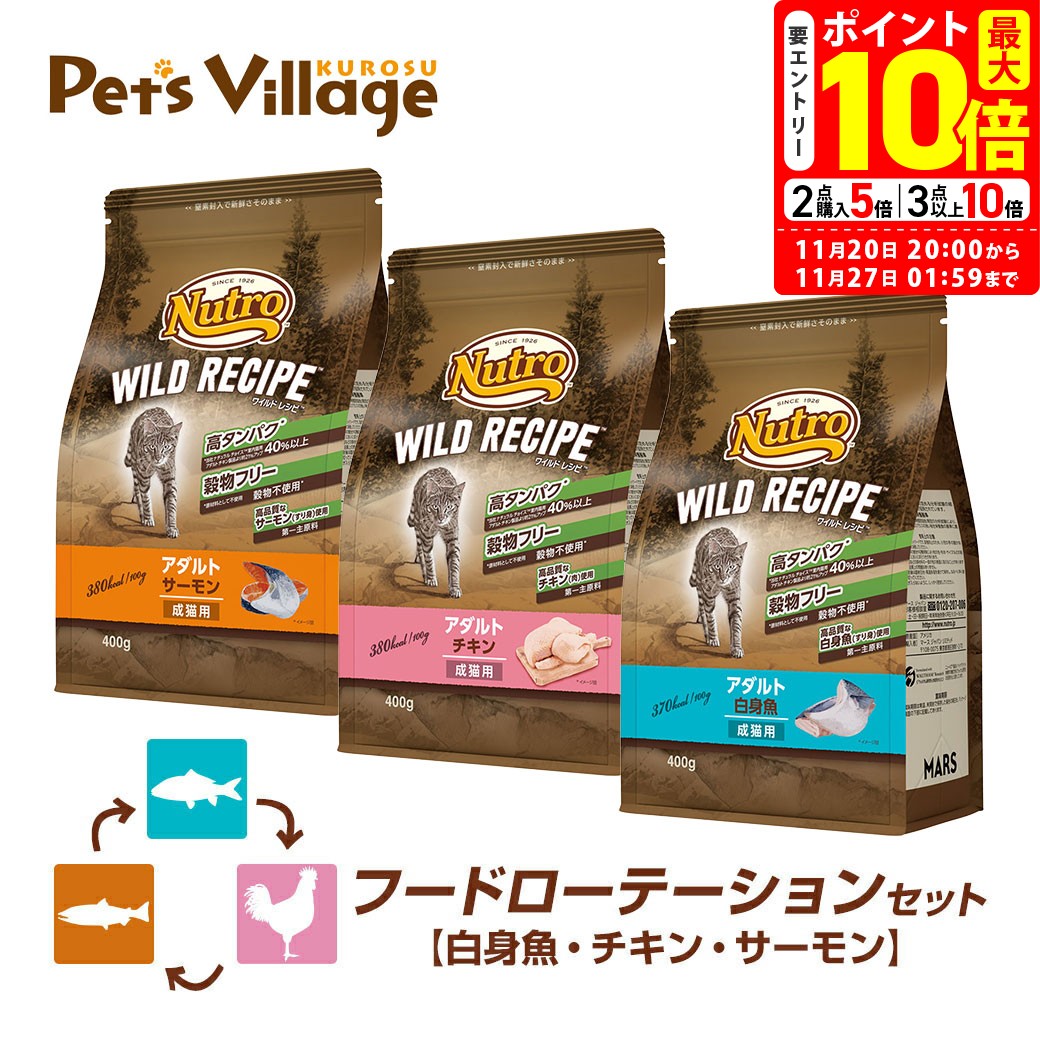 ポイント最大10倍!11/20 20:00〜11/27 01:59まで|フードローテーションセット 公認店 ニュートロ キャット ワイルドレシピ アダルト 白身魚 チキン サーモン 成猫用 400g×3種 ごはん ご飯 【ワイルドレシピ(WILD RECIPE)】[キャットフード] ペッツビレッジクロス