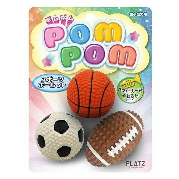 ◇プラッツ ポムポム スポーツボール 3P | ポムポム スポーツボール おもちゃ ボール 犬 小型犬 超小型犬 ラテックス ボール 笑える 中にスクイーカー 音が鳴る 楽しい 転がす 遊ぶ 柔らかい 可愛い ラグビー サッカーボール バスケットボール フットボール