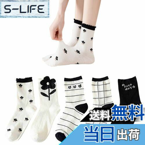 【送料無料】[FASELE] 靴下 ソックスレディース クルーソックス くつした スポーツソックス 綿 黒 白 ピンク 笑顔 花柄 ハート柄 可愛い おしゃれ 森系少女 通気 薄手 春夏秋冬 5足セット 22-25cm 色:花柄5点セット、サイズ:22.0-25.0 cm