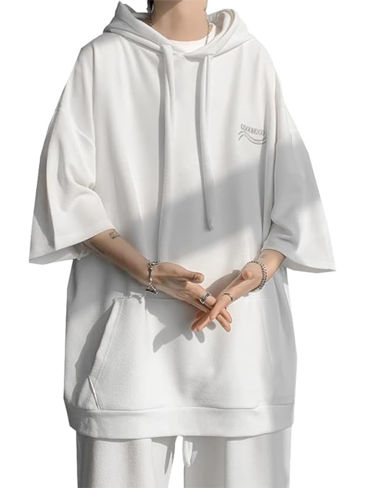 [SUKESEM]パーカーメンズ半袖七分袖tシャツおしゃれ大きいサイズフード付きゆったりスポーツウェアカジュアルプルオーバー(白M)